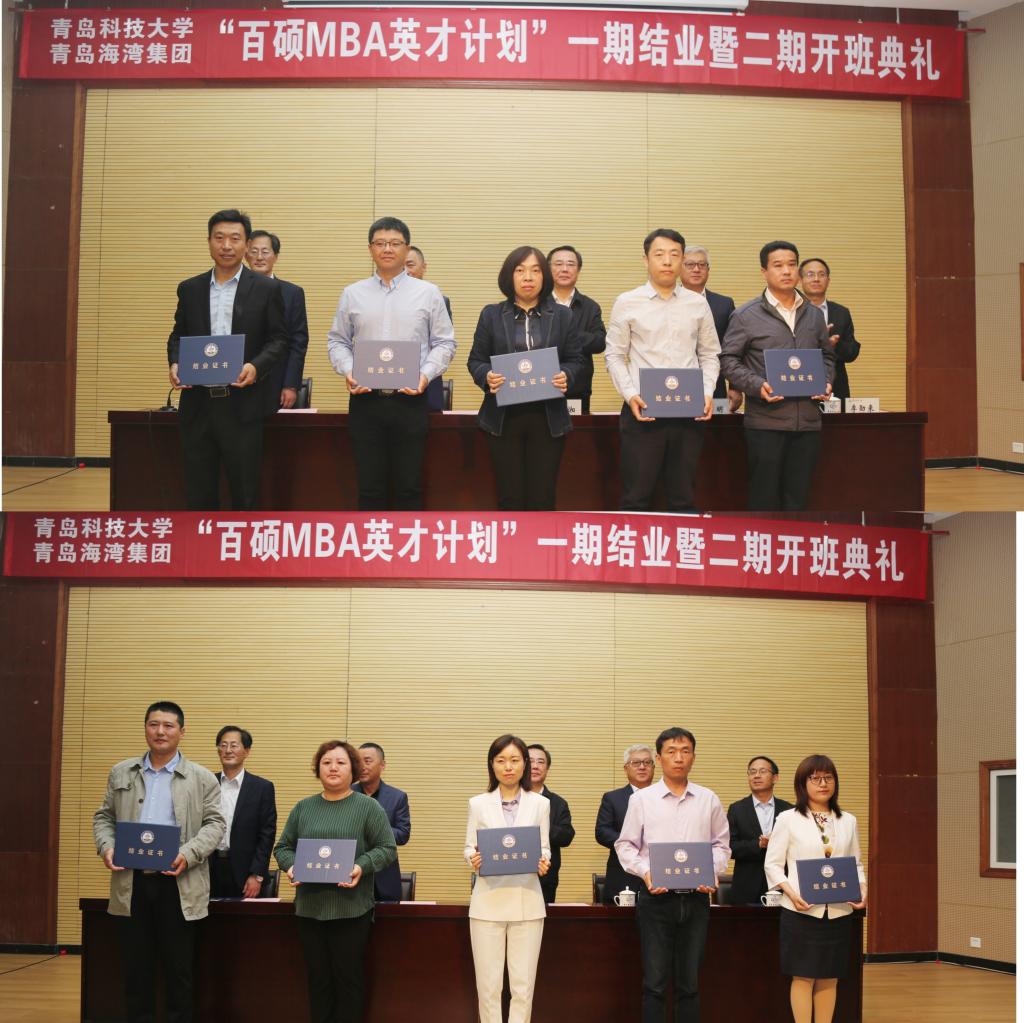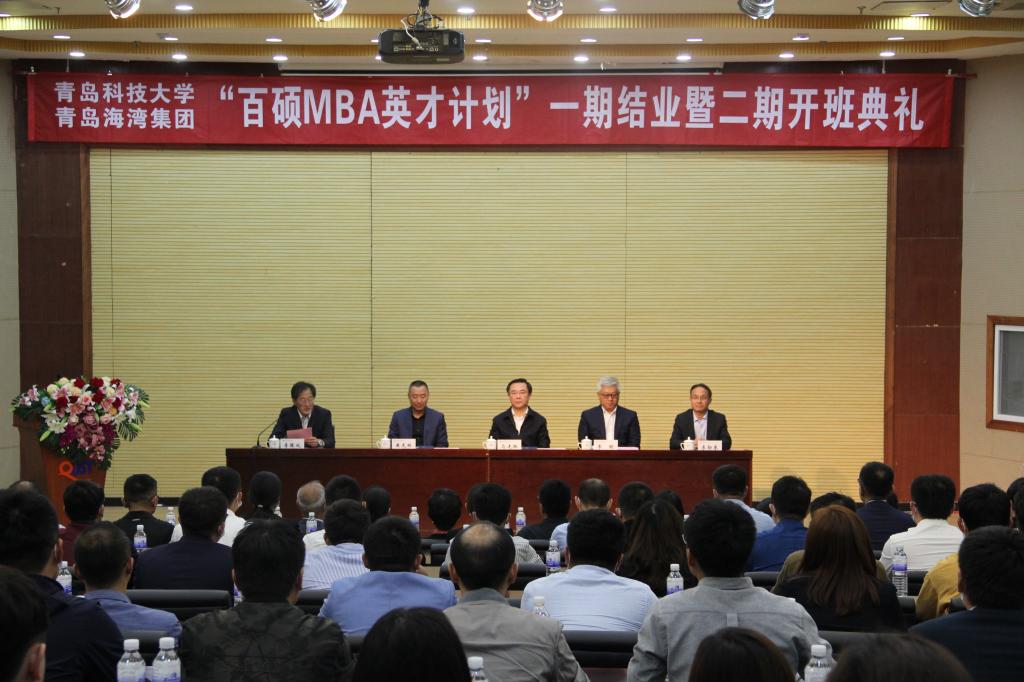 5月22日上午,bat365官方官网与青岛海湾集团有限公司“百硕MBA英才计划”一期结业暨二期开班典礼在崂山校区第一报告厅隆重举行,校党委书记马连湘、青岛海湾集团有限公司董事长兼总经理李明出席典礼并讲话。青岛海湾集团有限公司副总经理黄虎林、经管学院院长兼MBA中心主任李勋来等班子成员、培训班授课老师代表以及一期学员代表、二期周六班上课学员共计百余人参加了典礼。典礼由学院党委书记李德成主持。