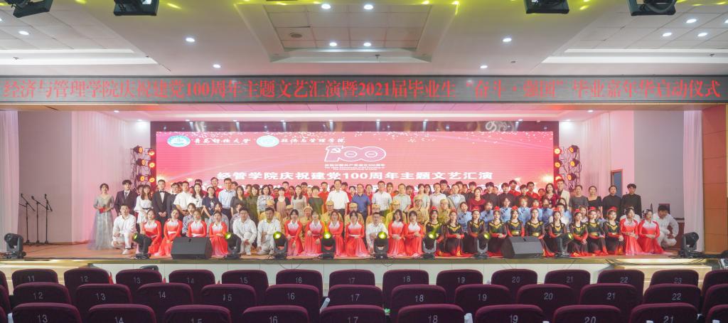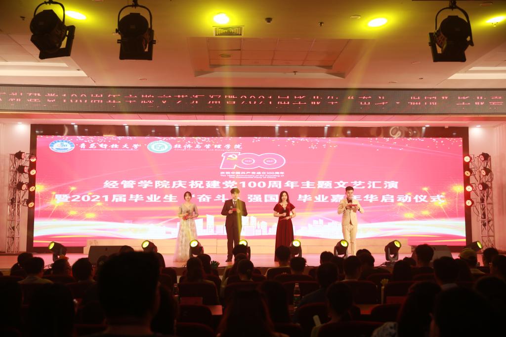 百年征程波澜壮阔,百年初心历久弥坚。6月19日晚,庆祝建党100周年主题文艺汇演暨2021届毕业生“奋斗·强国”毕业嘉年华启动仪式在崂山校区第二报告厅隆重举行。学院党委书记李德成、院长李勋来、党委副书记兼副院长刘跃宁、副院长宫攀、副院长吕承超出席晚会现场,各系主任、教师代表、各年级辅导员及学生共同观看了演出。