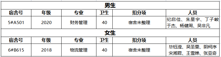 卫生检查结果及扣分细则请见附件,接下来,学院将针对消防安全、违禁电器使用等情况进行不定期抽查,请各年级对照问题监督好不合格宿舍的整改。