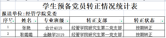 根据《中国共产党章程》和《中国共产党发展党员工作细则》及学校党委《关于发展学生党员工作的意见》(青科大党字〔2014〕77号)文件要求,经管学院研究生党支部于2022年6月9日召开预备党员转正大会讨论张艳等2位同志的转正问题(按姓氏笔画排序),同意以上同志按期转为中共正式党员,现将该2名同志情况予以公示。公示期为2022年6月9日至2022年6月15日。如有异议,请于公示期内到经管学院党委反映。