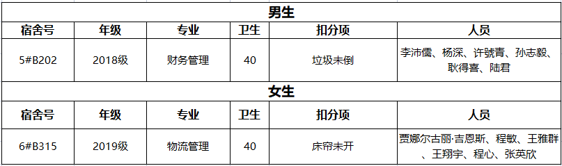 卫生检查结果及扣分细则请见附件,请各年级对照问题监督好不合格宿舍的整改。