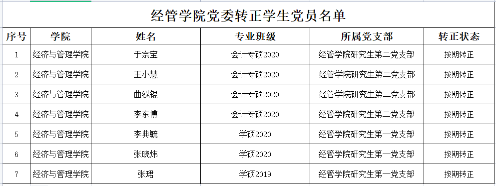 根据《中国共产党章程》和《中国共产党发展党员工作细则》及学校党委《关于发展学生党员工作的意见》(青科大党字〔2014〕77号)文件要求,经管学院研究生第一党支部、研究生第二党支部于2022年11月25日召开预备党员转正大会讨论张珺等7位同志的转正问题(按姓氏笔画排序),同意以上同志按期转为中共正式党员,现将该7名同志情况予以公示。公示期为2022年11月25日至2022年12月1日。如有异议,请于公示期内到经管学院党委反映。