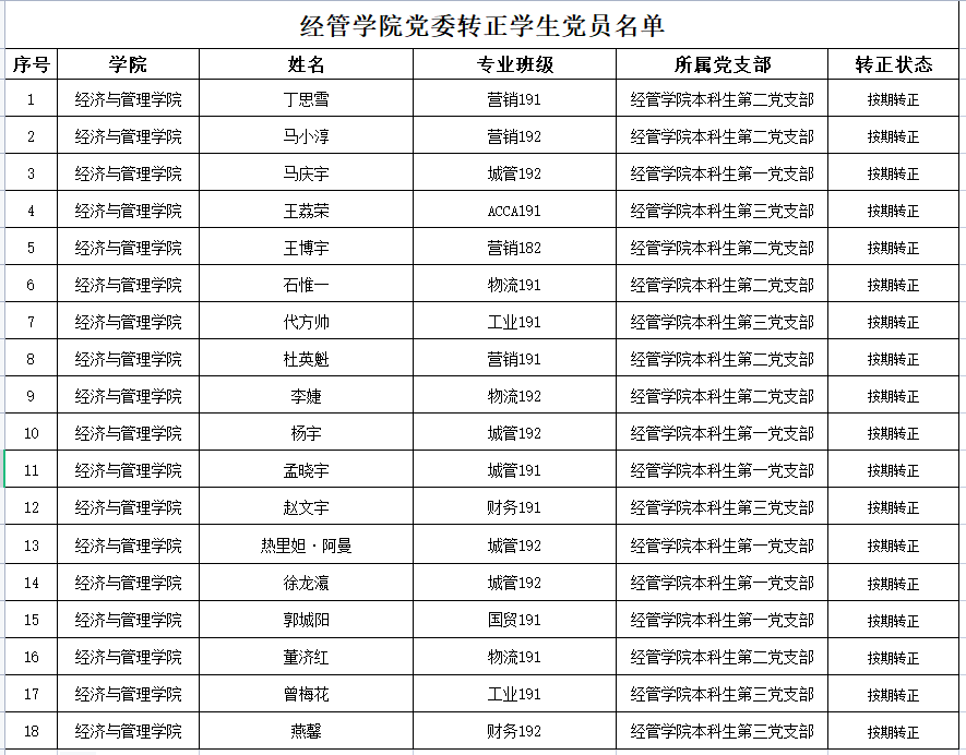 根据《中国共产党章程》和《中国共产党发展党员工作细则》及学校党委《关于发展学生党员工作的意见》(青科大党字〔2014〕77号)文件要求,经管学院本科生第一党支部、本科生第二党支部、本科生第三党支部于2022年12月2日召开预备党员转正大会,讨论丁思雪等18位同志的转正问题,同意以上同志按期转为中共正式党员,现将该18名同志情况予以公示。公示期为2022年12月2日至2022年12月9日。如有异议,请于公示期内到经管学院党委反映。