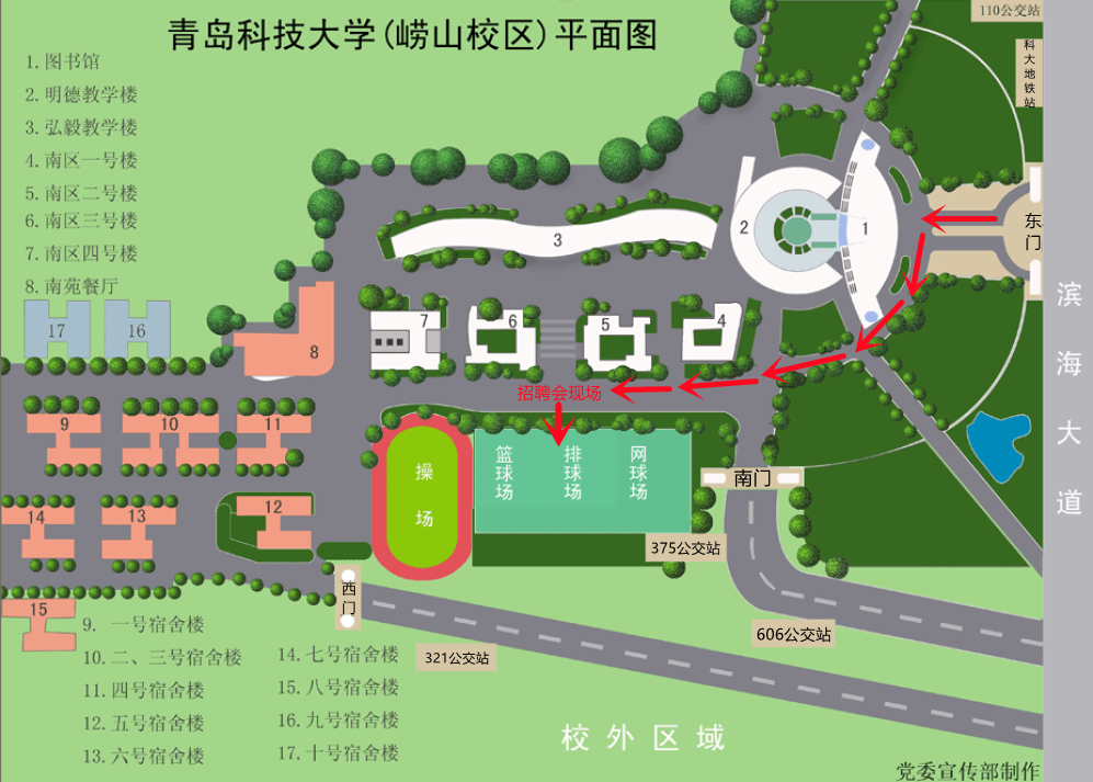 1.请参会企业于招聘会当天上午8:50之前到报道地点进行签到。招聘会位于山东省青岛市松岭路99号bat365官方官网崂山校区弘毅广场外篮球场,建议乘坐公共交通工具到校,自驾车请从东门(松岭路)入校,入校后左拐,直行500米左右,即可到达报道地点。车辆请按指定位置停放。