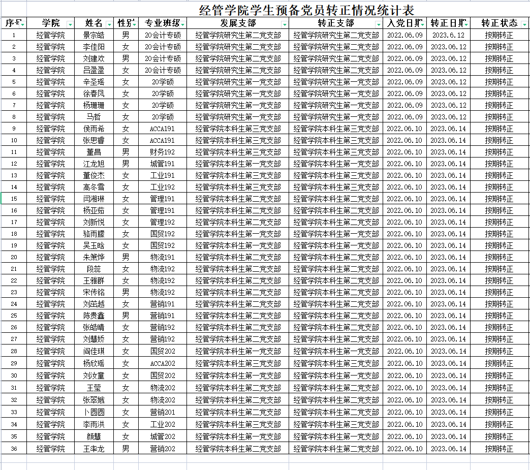 根据《中国共产党章程》和《中国共产党发展党员工作细则》及学校党委《关于发展学生党员工作的意见》(青科大党字〔2014〕77号)文件要求,经管学院学生党支部于2023年6月12日至6月14日召开预备党员转正大会讨论景宗皓等36名同志的转正问题,同意上述同志按期转为中共正式党员,现将其情况予以公示。公示期为2023年6月14日至2023年6月20日。如有异议,请于公示期内到经管学院党委反映。