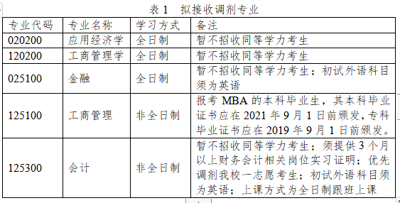 3.第一志愿报考工商管理、公共管理、旅游管理、工程管理、会计、图书情报、审计等专业学位的考生可相互调剂,但不得调入其他专业,其他专业考生也不得调入以上7个专业。调入专业为工商管理的对考生有工作年限要求(参考我校招生简章)。