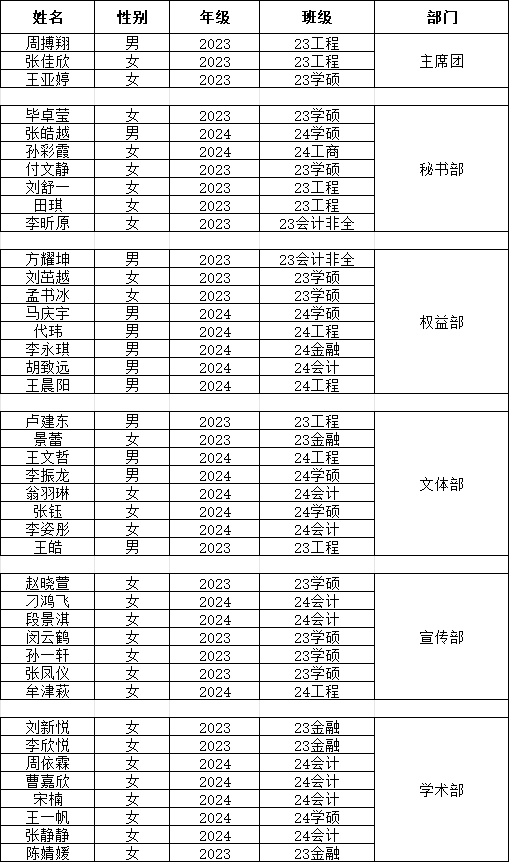 根据《关于公开选拔bat365官方官网新一届研究生会干部的通知》要求,经个人申请、资格审核、学院评审,现将经管学院新一届研究生会干部拟任名单予以公示,公示期3个工作日。公示时间:2025年3月4日-2025年3月6日。