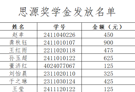 为鼓励先进,树立榜样,营造良好的学习实践氛围,对在学习、实践等方面表现突出或者因突发状况导致家庭经济困难的学生进行一定数额奖(助)学金的鼓励和支持。根据学院思源奖学金评选要求,经学院研究,决定对在2025年校学生运动会中表现优异的先进个人发放思源(体育)奖学金并予以表彰。现对获得者名单予以公示,有意见或建议者,请于公示期内,以电话或者书面形式向经管学院学工办(团委)或党委反映。