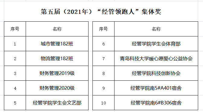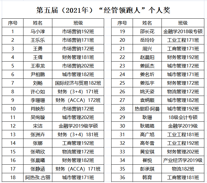 为引导青年学子坚定理想信念,锤炼过硬本领,弘扬“三牛”精神,将党史学习教育与指导实践结合起来,以优异成绩向建党一百周年献礼。经管学院结合工作实际,于2021年4月开展“第五届(2021年)经管领跑人”评选,表彰2020年表现优异的集体和个人。经研究决定,特授予城市管理182班等10个集体(2021年)“经管领跑人”集体奖,马小淳等36名同学(2021年)“经管领跑人”个人奖(按姓氏笔画排序)。现将评选结果予以公示,公示期为3个工作日,公示时间2021年4月27日-2021年4月29日。
