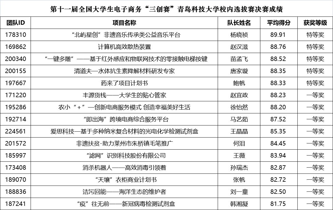 根据《第十一届全国大学生电子商务“创新、创意及创业”挑战赛参赛报名通知》《关于组织参加第十一届全国大学生电子商务“创新、创意及创业”挑战赛校内选拔赛的通知》的安排,学校于2021年5月9日举办了校内选拔赛现场决赛。现场决赛中专家评委严格按照大赛评审流程和评分细则,对参赛项目作品进行了评审评分,根据评审结果,现将决赛成绩公布如下: