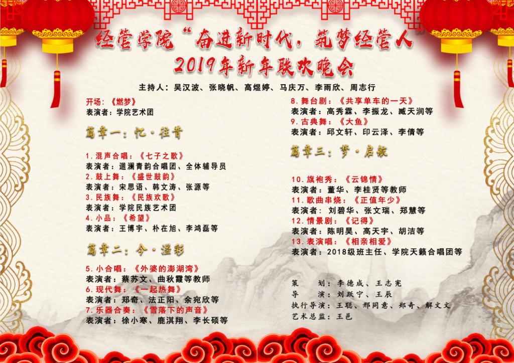 为唱响主旋律,弘扬正能量,迎接2019年的到来,经管学院将于12月20日在第二报告厅举办经管学院“奋进新时代 筑梦经管人”2019年新年联欢晚会。