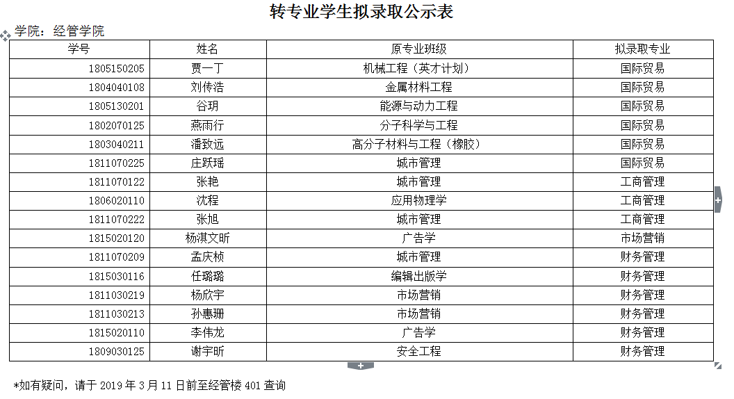 经管学院于2019年3月7日举行转专业考核,经过严格的笔试和面试考核,并按照分数从高到低的排序,现将拟录取名单公布。
