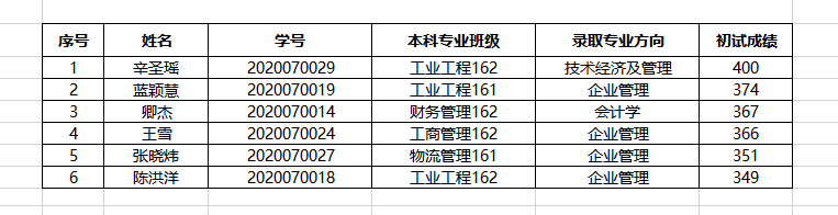 为了提升学术型研究生招生质量,鼓励我院崂山校区优秀本科毕业生第一志愿报考我院学术型研究生,根据学院研究生新生奖学金(学院自设)评选办法,我院工业工程162班辛圣瑶等6名同学获得研究生新生奖学金,奖励人民币6000元,名单公示如下: