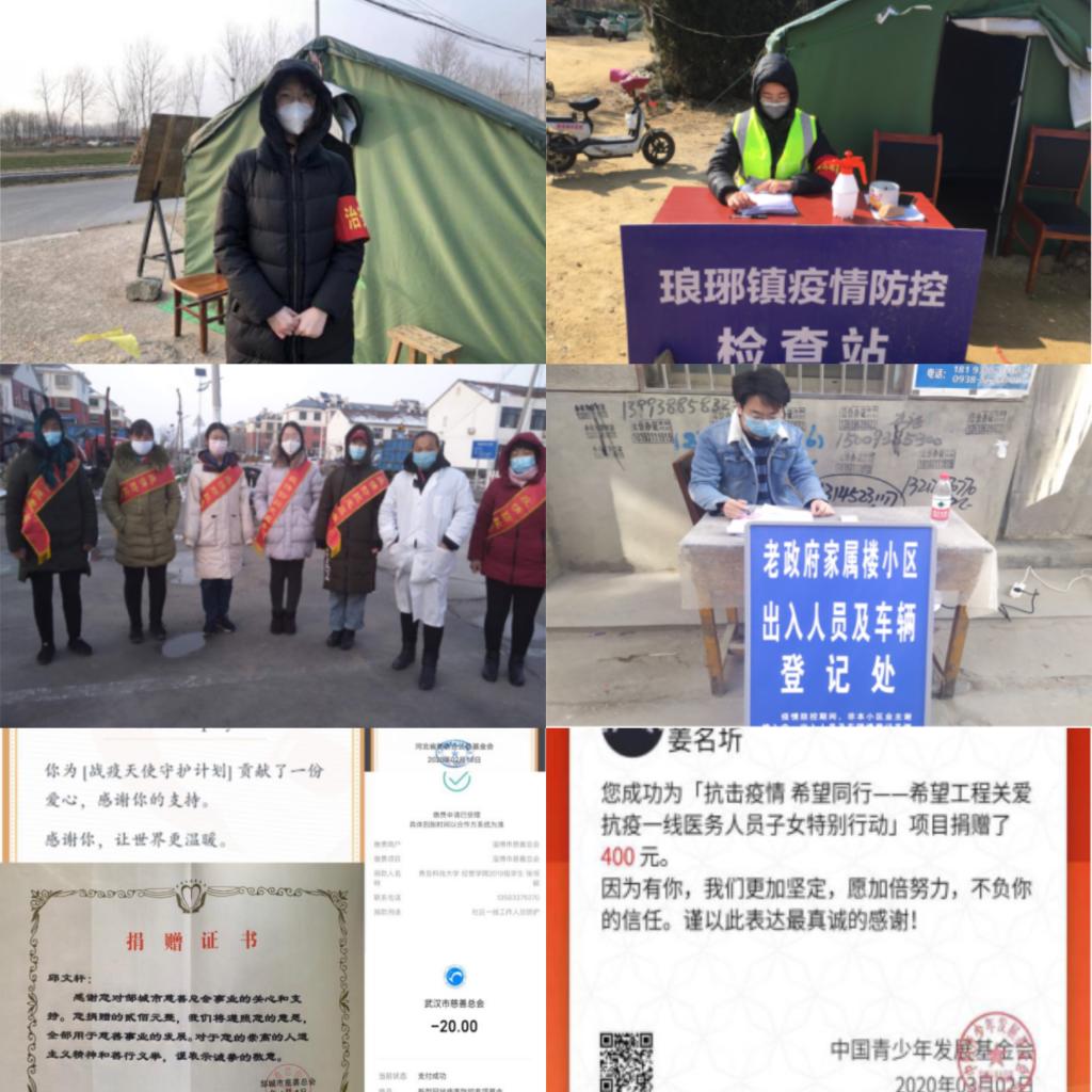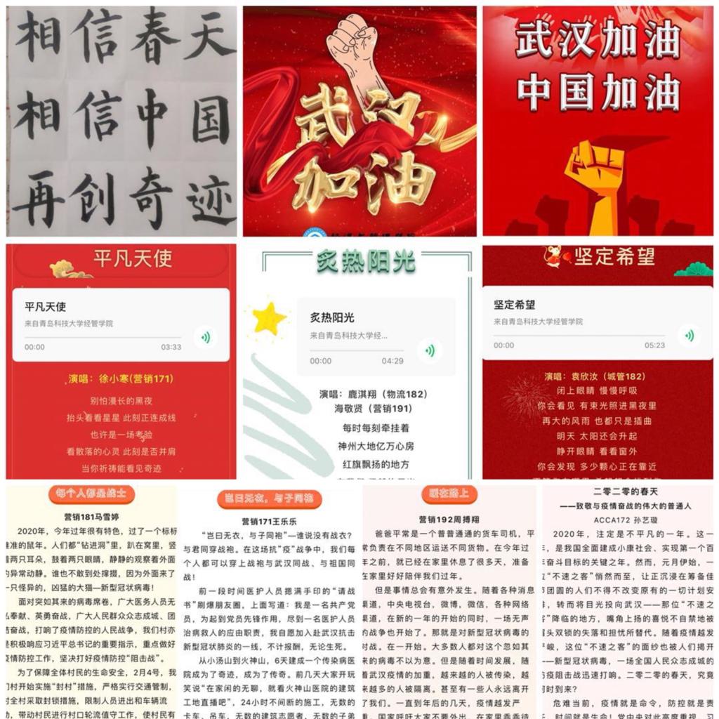 抗疫当前,每个人都是防线,每个青年都是战士。为助力打赢新冠肺炎疫情防控阻击战,经管学子纷纷行动起来,在做好自我防护的前提下,以力所能及的方式投入到防控一线工作中去。他们有的坚守在宣传一线为大家把疫情防控相关信息及时准确地发布;有的通过绘画、书法、撰稿的方式在网络上积极传递正能量;有的争当志愿者在当地社区疫情防控工作中发挥自己的光和热;有点通过官方渠道参与捐款活动,为抗击疫情贡献爱心。凝心聚力,冲锋一线,用行动彰显了新时代青年学子的热血担当。