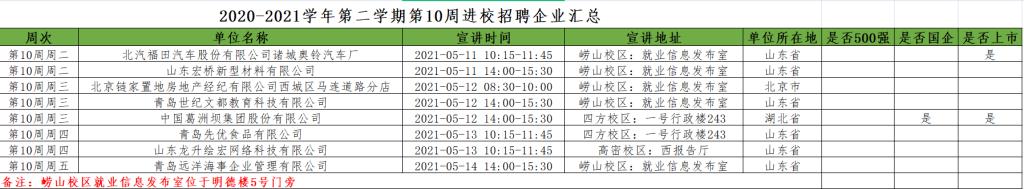 【校园宣讲会】2020-2021学年第二学期第10周进校招聘企业汇总