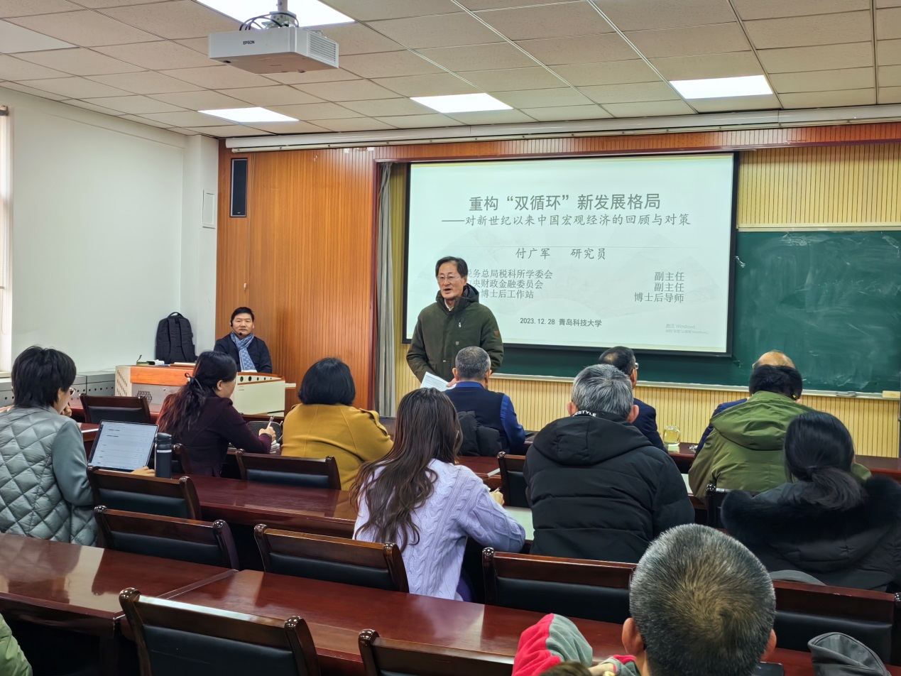 bat365官方官网于12月28日下午,在经管楼505会议室组织开展学术讲座,本次学术讲座邀请了国家税务总局税科所学术委员会副主任付广军为经管学院师生带来《重构“双循环”新发展格局》的讲座分享。活动由bat365官方官网党委书记李德成主持,学院老师和研究生同学参加此次论坛。