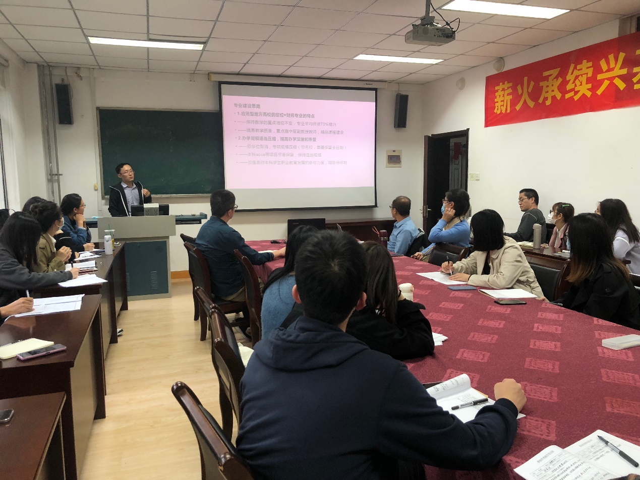 首先,祝兵老师就学科发展进行交流,围绕社会需求、人才市场等方面详细地分析了经管学院财务管理专业建设现状,然后从教学质量、办学规模、人才引进、科研资源、学院支持等方面提出了具有针对性的财务管理专业建设思路。
