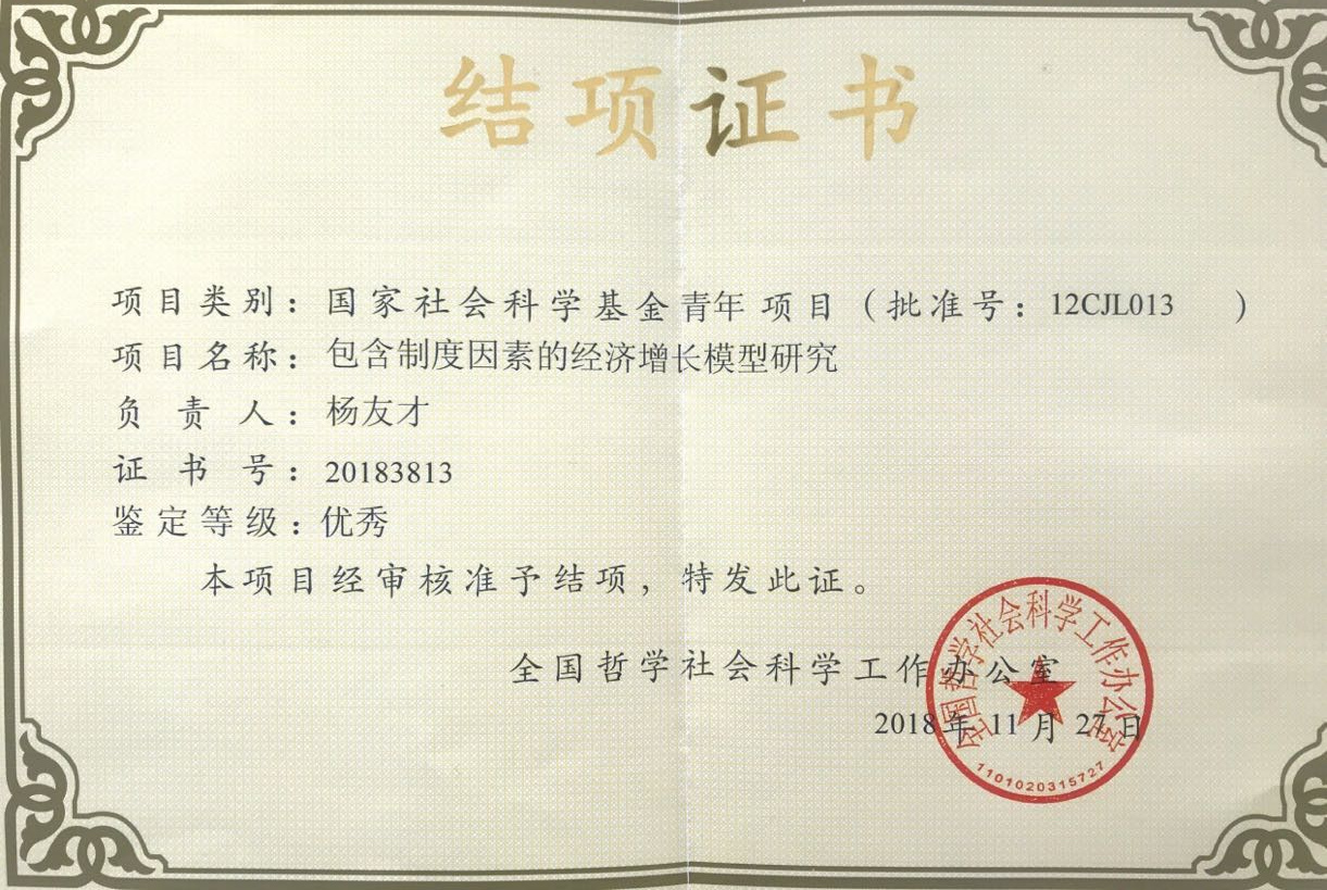 近日,经管学院收到了一份沉甸甸的证书:杨友才教授所主持的国家社科基金《包含制度因素的经济增长模型研究》通过结题验收,等级为“优秀”。这是我校国家社科基金结题首次获得优秀。课题组在《金融研究》、《学术月刊》、《statistics and Probability Letters》、国务院研究《决策参考》等CSSCI、SCI杂志和重要刊物发表论文11篇,并与国内外一些著名经济学家形成了良好的合作机制。最终成果包括10万多字论文集和10万字以上研究报告,并完成了多名研究生的培养。项目组超额完成预定的研究任务,在一些理论上实现突破,具有较强的社会影响与应用价值。