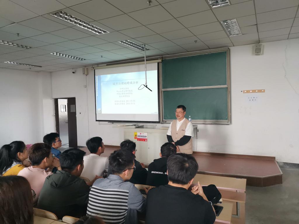汪教授指出城市治理的复杂源头本质是“人”,“人”作为公共事务管理系统区块中的“个体”,是我们解决社会矛盾的入手点,如果把人搞清楚了,那么城市治理的跨域分析就变得简单化。在报告过程中,汪教授运用了一些新颖的方法描述社会发展,为了方便师生理解,汪教授把城市管理系统区块总结三个关键词:“群体”、“个体”和“载体”,“个体”即社会中每个人,“群体”则为个体间相互连接的结果,而“载体”又称“平台”是现存的社会条件。汪教授强调,我们作为社会中的小个体,要拥有自己的大局观和处世观,尽量做到言行一致,在此基础上利用现有的载体条件才能形成个体与群体之间的良好连接。最后,汪教授向我们推荐了一些深入了解中国两岸发展的书籍和视频,有利于我们更好地了解城市治理相关的内容。