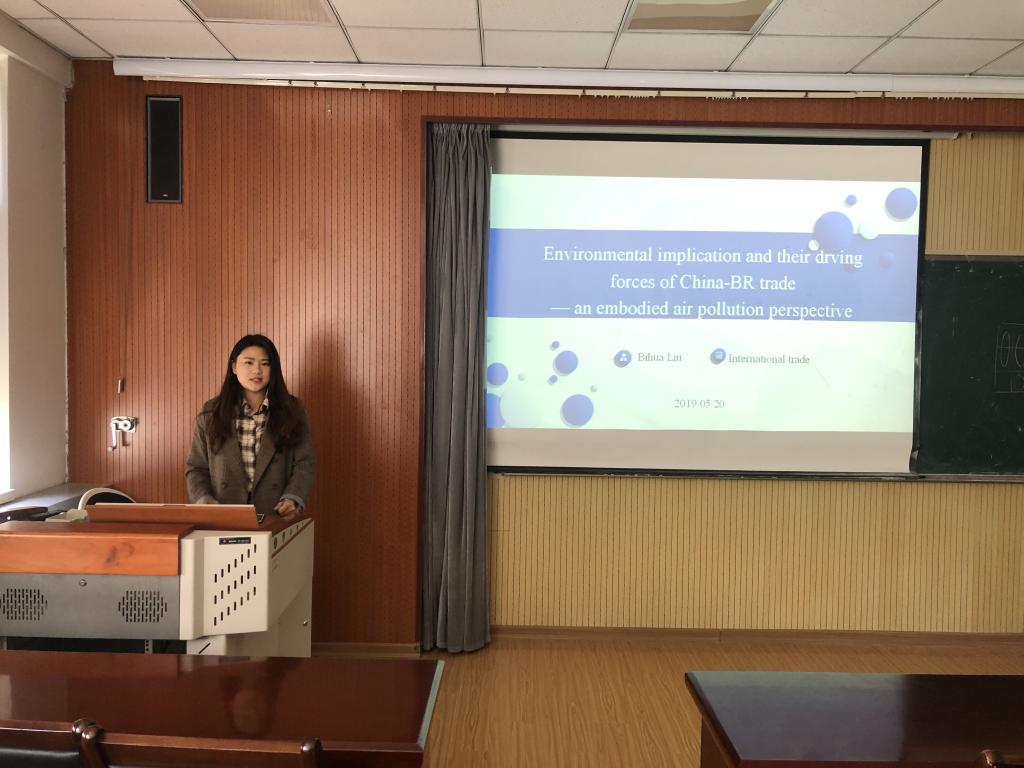 论坛开始,2017级研究生刘碧华向在座师生汇报了题为《Environmental implication and their driving forces of China-BR trade——an embodied air pollution perspective》的论文,该论文基于投入与产出模型,从隐含环境污染角度出发,探索绿色一带一路的影响因素,得出中国在一带一路中处于优势地位等的一系列结论。她发现影响绿色一带一路发展的最大因素为技术的进步,并且最后为一带一路未来发展提出合理的政策建议。教师代表李长胜和周南南对论文做了精彩的点评,并提出了合理的修改建议。