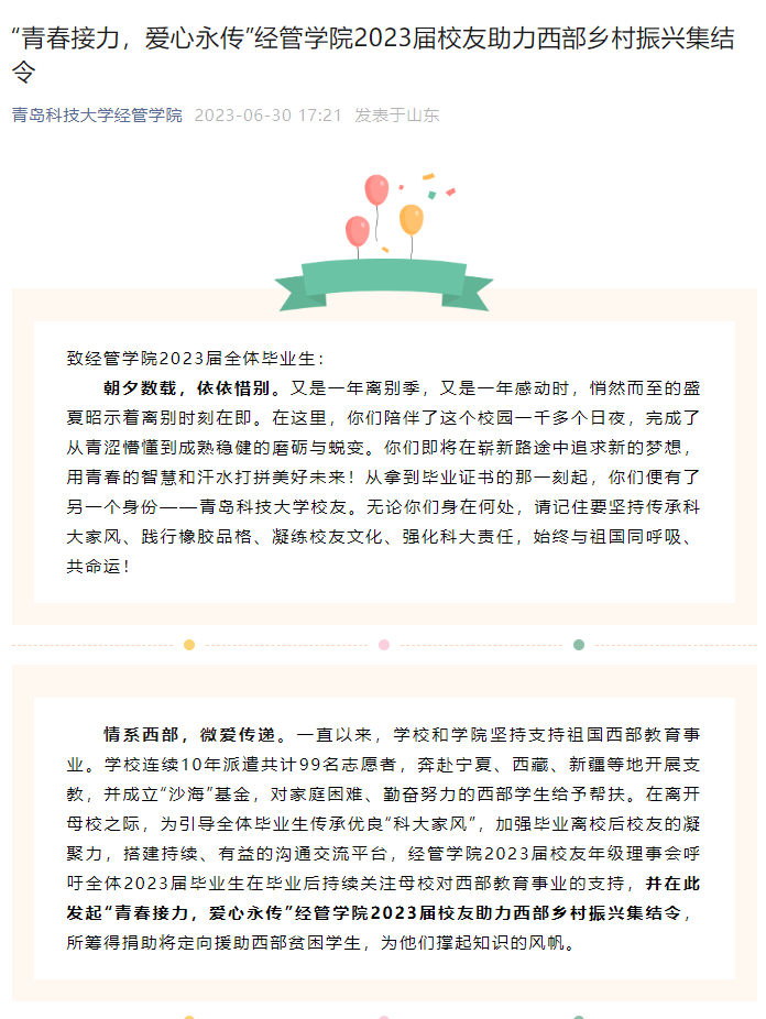 为深入推进习近平新时代中国特色社会主义思想学习,增强毕业生们的社会责任感,提升服务意识和奉献意识,经管学院面向2023届全体毕业生,发起“青春接力,爱心永传”经管学院2023届校友助力西部乡村振兴集结令,呼吁同学们于每年6月29日毕业离校日发起募捐,通过学校团委“沙海”基金定向捐助西部贫困学生,并每年及时更新历年全部受捐助西部贫困学生的学习、生活等成长记录。6月24日、25日,学院在南苑5、6号楼楼下设置闲置物品捐赠回收点,呼吁2023届毕业生将闲置的书籍、文具、衣物等捐赠西部地区,教育引导青年学生勇于担当,情系西部,共同推动西部教育事业的蓬勃发展。